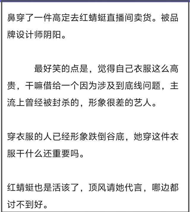 当高定品牌设计师得知baby穿着自家衣服去带货直播之后,立马发了火,明确表示从未授权baby穿着他家高定参加商业活动,特别是宣传cheap shoes(廉价鞋子),嫌弃之意溢于言表。
