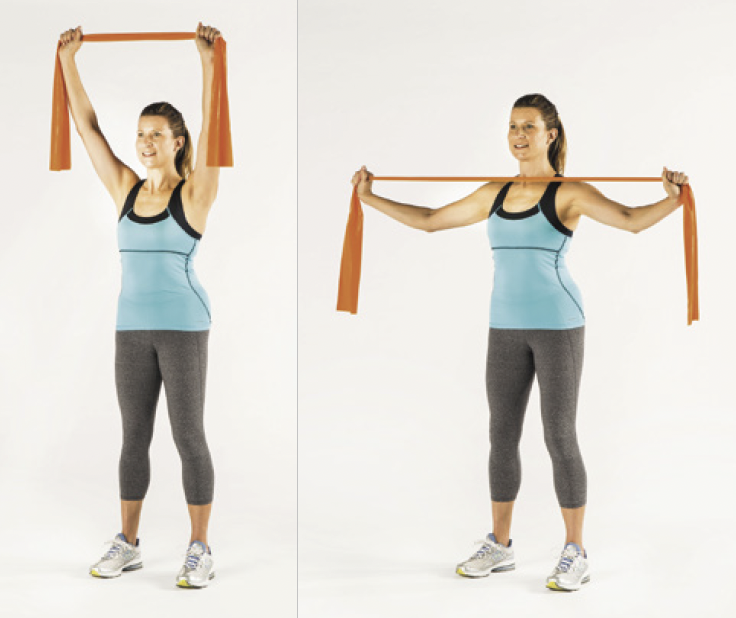 微微弯曲肘部,将双手向下拉,将带子拉伸到约肩膀高度。慢慢将手臂抬过头顶回到起始姿势,抵抗带子的拉力。
