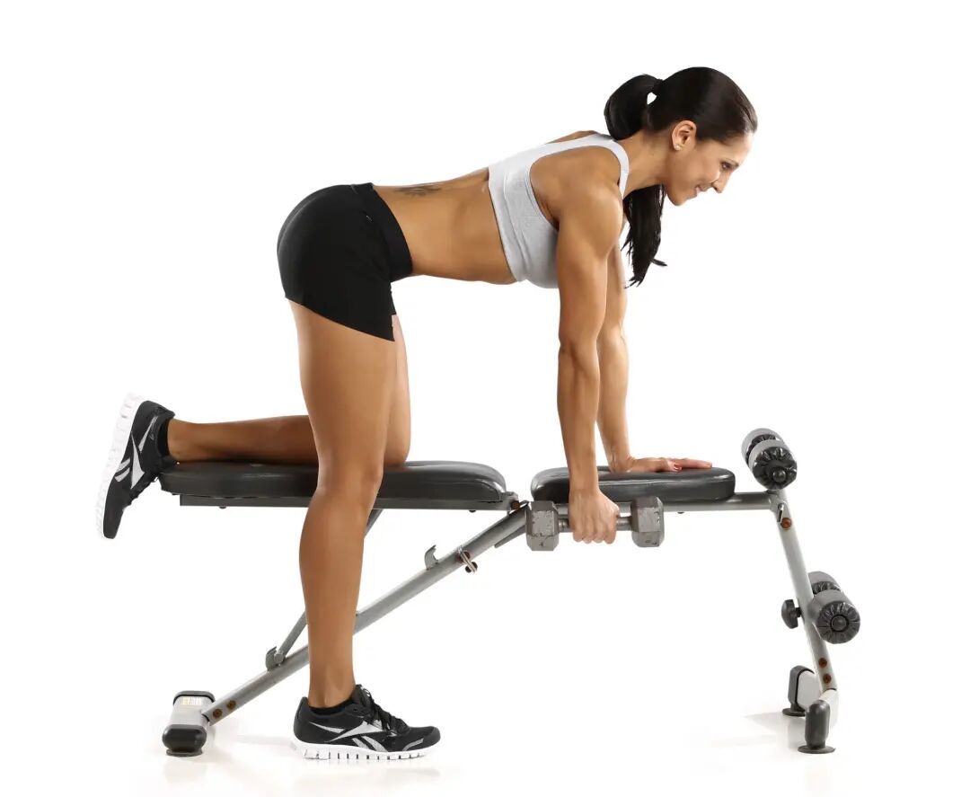 右手持重物站立,左侧放置长凳或结实的椅子。将左手和膝盖放在长凳或椅子座上。右臂直接垂至右肩下方,完全伸展。脊柱应保持中立,肩部和臀部保持直线。