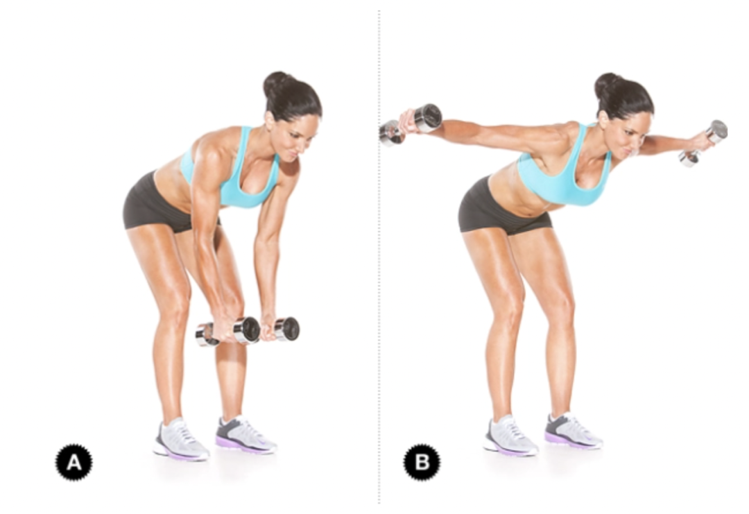 将肩胛骨挤压在一起,然后弯曲肘部,慢慢将重量提升到肋部,回到起始姿势。
